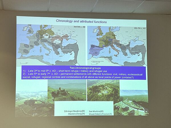 La première des trois conférences était en lien direct avec la participation de la conférencière à un réseau européen sur les sites de hauteur tardo-antiques, l'International Scientific Network - Late Antique Hilltop Settlements in Europe (LAHIS) de l’Académie bavaroise des Sciences (https://lahis.badw.de). Différents exemples ont été présentés au public, mettant notamment en évidence la réoccupation de sites de l’âge du Bronze à la veille du Moyen Âge. La question du lien avec les pratiques des populations germaniques de l’époque des Grandes Migrations, entre autres les Alamans, a d’ailleurs été posée.
